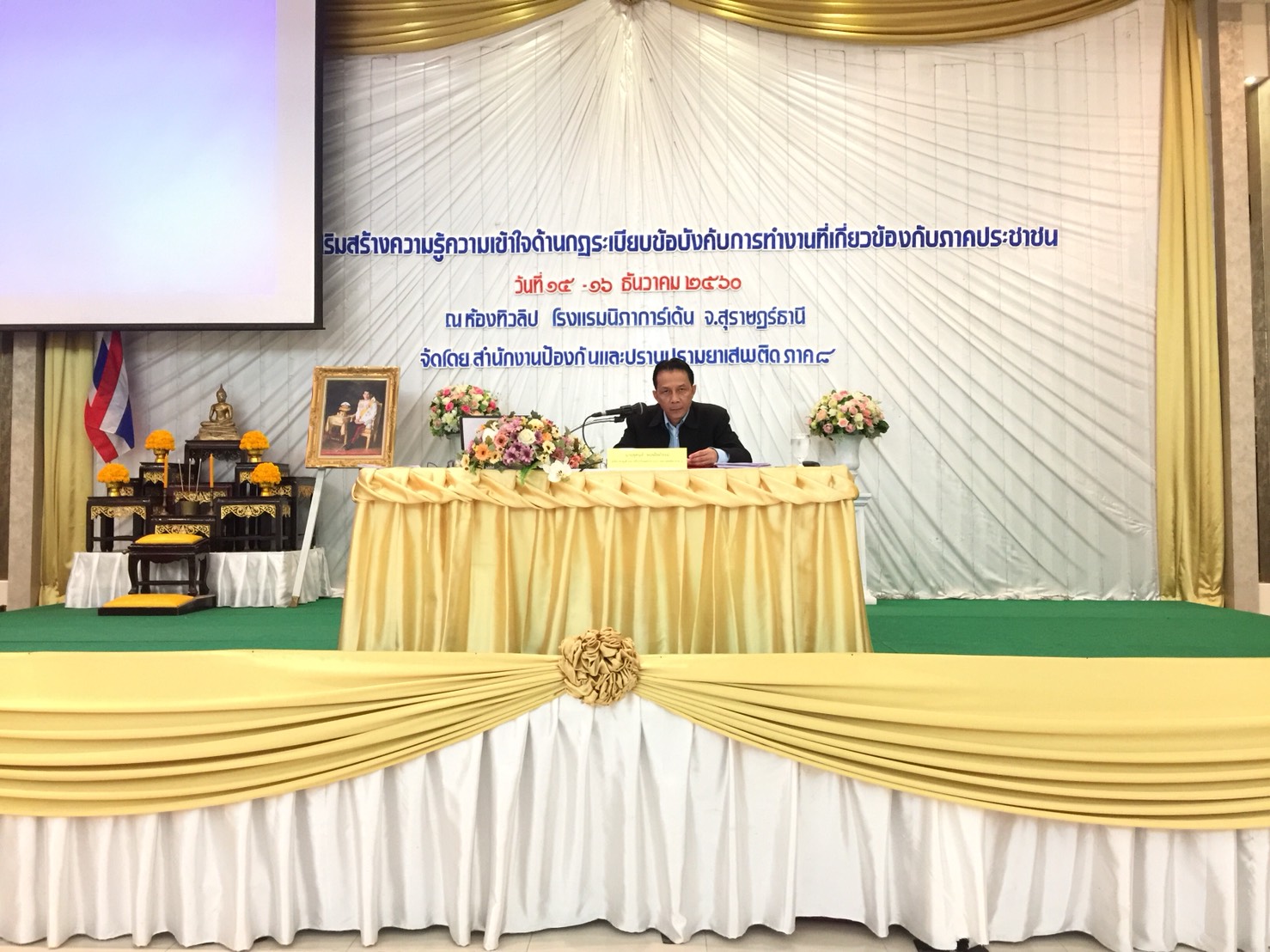 วันที่ 15 ธันวาคม 2560 นายยุคนธ์ พงษ์ไพโรจน์ ผู้เชี่ยวชาญด้านการป้องกันและปราบปรามยาเสพติดภาค 8 เป็นประธานในพิธีเปิด ในโครงการเสริมสร้างความรู้ความเข้าใจด้านกฎระเบียบข้อบังคับการทำงานที่เกี่ยวข้องกับภาคประชาชน เพื่อเป็นการบูรณาการกับหน่วยงานภาคีในพื้นที่ที่ขอรับการสนับสนุนงบเงินอุดหนุน ได้มีความเข้าใจเกี่ยวกับหลักเกณฑ์ และวิธีการเบิกจ่ายงบประมาณตามระเบียบ สำนักงานคณะกรรมการการป้องกันและปราบปรามยาเสพติดว่าด้วยงบเงินอุดหนุนด้านการป้องกันและแก้ไขปัญหายาเสพติด (ฉบับที่ 7 ) พ.ศ. 2560 และเพื่อให้องค์กรได้ทราบกรอบแผนงานงบเงินอุดหนุนเพื่อการป้องกันและแก้ไขปัญหายาเสพติด ปีงบประมาณ 2561 โครงการมีกำหนดจัดตั้งแต่วันที่ 15-16 ธันวาคม 2560 มีผู้เข้าร่วมโครงการประกอบด้วย เครือข่ายภาคเยาวชน เครือข่ายกองทุนแม่ของแผ่นดิน เจ้าหน้าที่ของสำนักงานพัฒนาชุมชน เจ้าหน้าที่สำนักงานสาธารณสุขจังหวัด และเจ้าหน้าที่ ปปส.ภ.8 รวมทั้งสิ้น 65 คน ณ โรงแรมนิภาการ์เด้น อ.เมือง จ.สุราษฎร์ธานี
