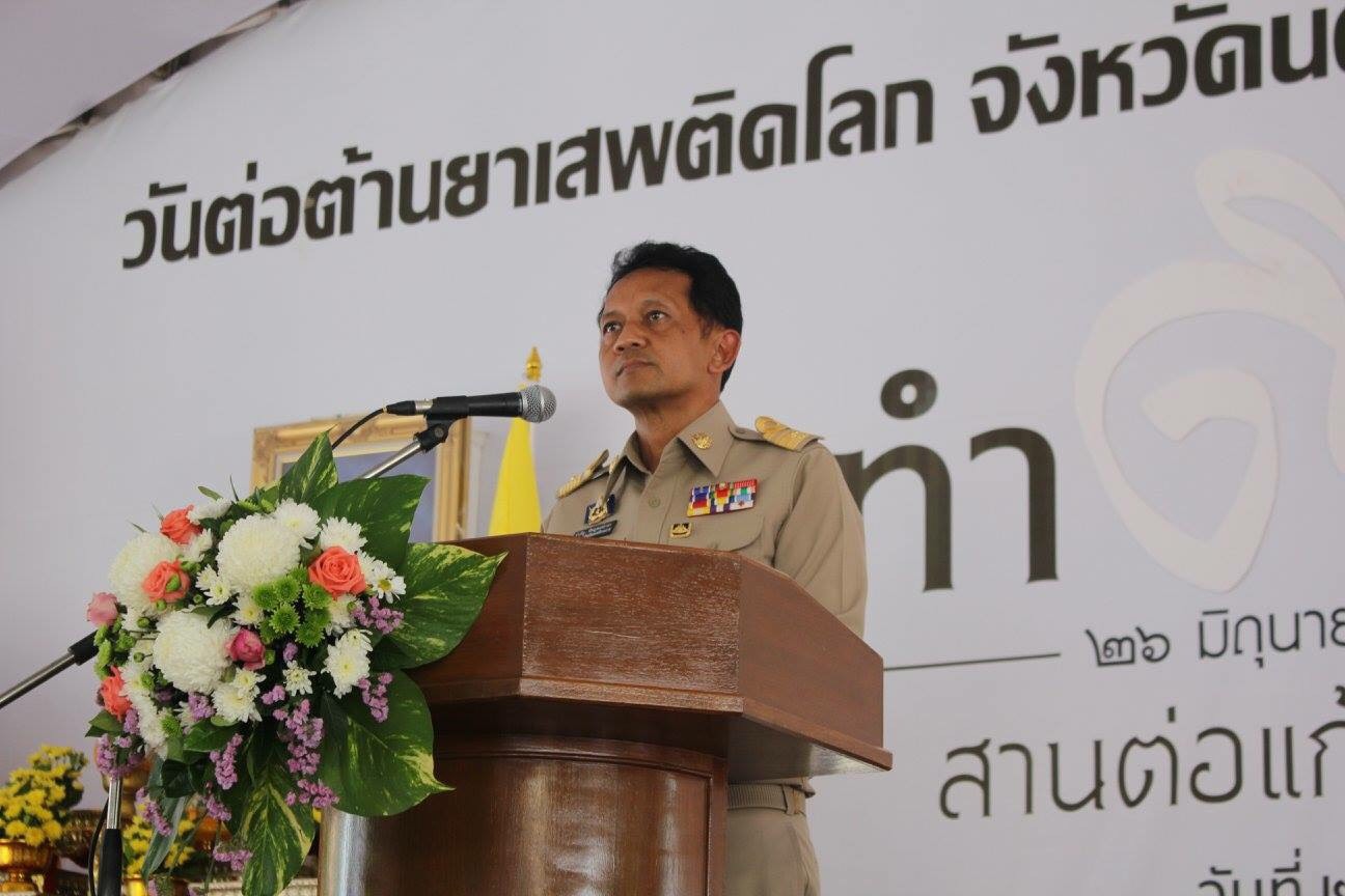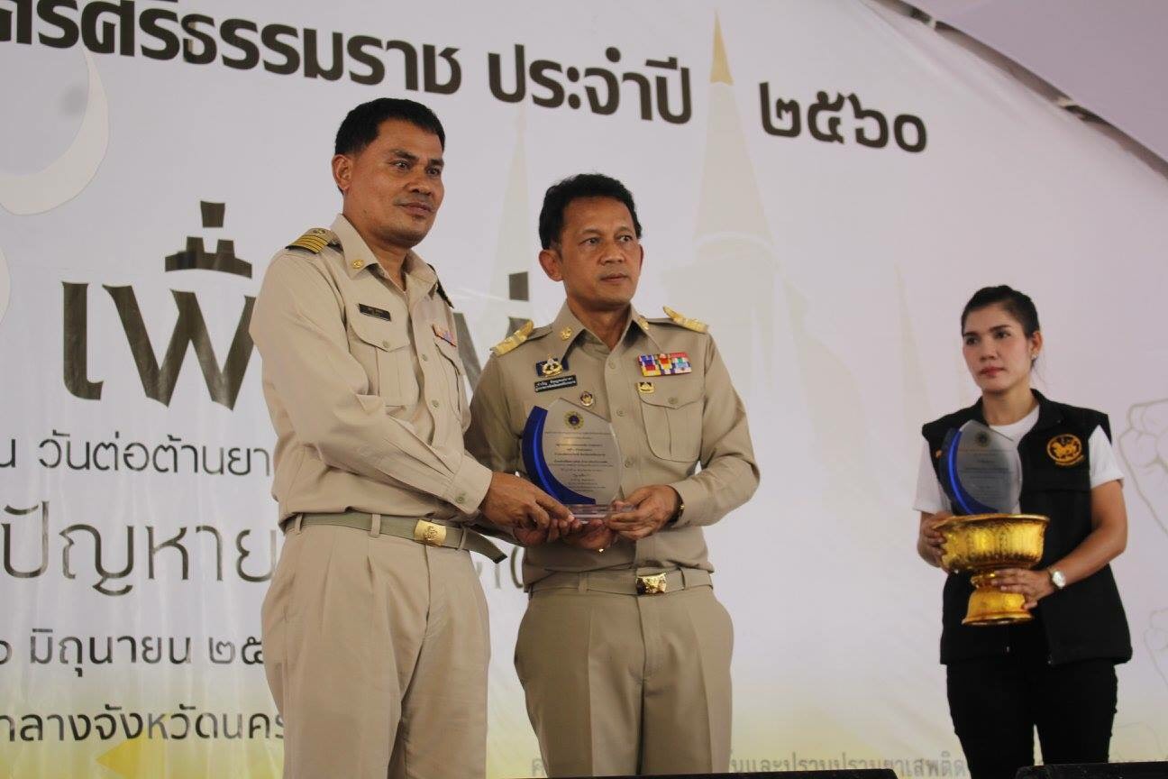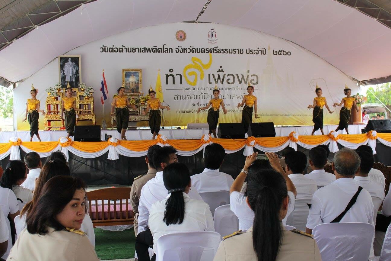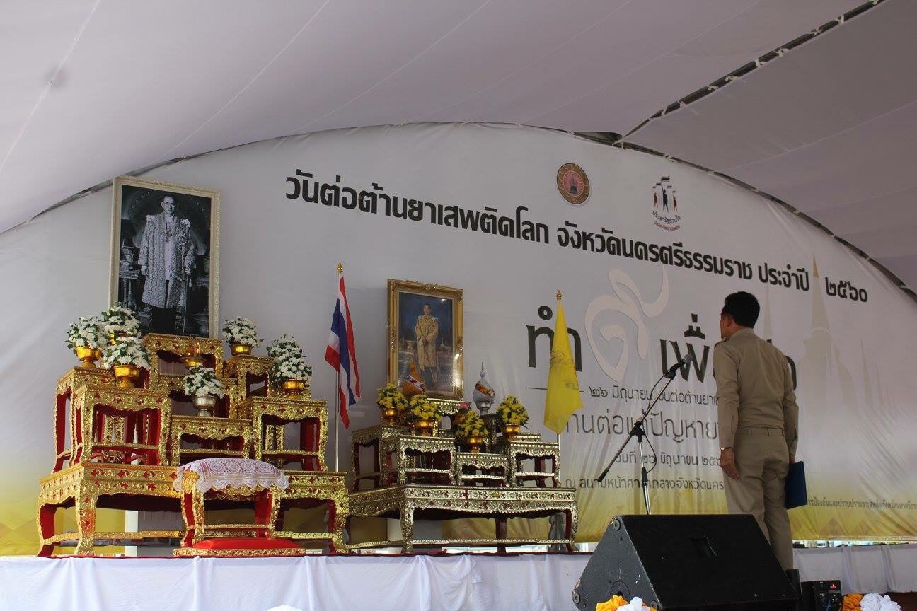 ยาเสพติด และให้ประชาชนรับรู้และเข้าใจนโยบายการแก้ไขปัญหายาเสพติด ลดความเดือดร้อน ความทุกข์ยากของประชาชน ให้ปลอดภัยจากปัญหายาเสพติด และเห็นถึงความสําคัญของวันต่อต้านยาเสพติด รวมทั้ง ให้ประชาชนได้ร่วมถวายความอาลัย พระบาทสมเด็จพระปรมินทรมหาภูมิพล อดุลยเดช รัชกาลที่ 9 ที่ทรงมีพระมหากรุณาธิคุณเป็นล้นพ้นต่อพสกนิกรชาวไทย โดยเฉพาะด้านการแก้ไขปัญหายาเสพติด และเพื่อให้ประชาชนได้แสดงความจงรักภักดีแด่ สมเด็จพระเจ้าอยู่หัวมหาวชิราลงกรณ บดินทรเทพยวรางกูร รัชกาลที่ 10 ประชาชนกล่าวคำปฎิญาณตนไม่ยุ่งเกี่ยวกับยาเสพติด การจัดนิทรรศการรู้เท่าทันยาเสพติด จากหน่วยงานและสถาบันการศึกษา การประกอบพิธีถวายสัตย์ปฏิญาณตนไม่ยุ่งเกี่ยวกับยาเสพติด และมีการมอบโล่และประกาศเกียรติคุณแก่องค์กร/บุคคลผู้มีผลงานดีเด่น จำนวน 27 ราย ณ บริเวณสนามหน้าศาลากลางจังหวัดนครศรีธรรมราช โดยมีนายจำเริญ ทิพญพงศ์ธาดา ผู้ว่าราชการจังหวัดนครศรีธรรมราช เป็นประธาน