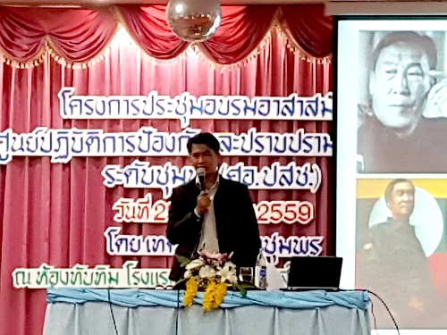 วันที่29 มิ.ย.59 ผู้แทน ปปส.ภ.8 นายอดุลย์ งามผิว และ นายทรงรัฐ รสสุคนธ์ นวค ชำนาญการ ร่วมกิจกรรมโครงการอบรมอาสาสมัครศูนย์ปฏิบัติการป้องกันและปราบปรามยาเสพติดชุมชนเทศบาลเมืองชุมพร ณ ห้องประชุมโรงแรมชุมพรการ์เด้น อ.เมืองชุมพร มีผู้เข้าร่วม200คน