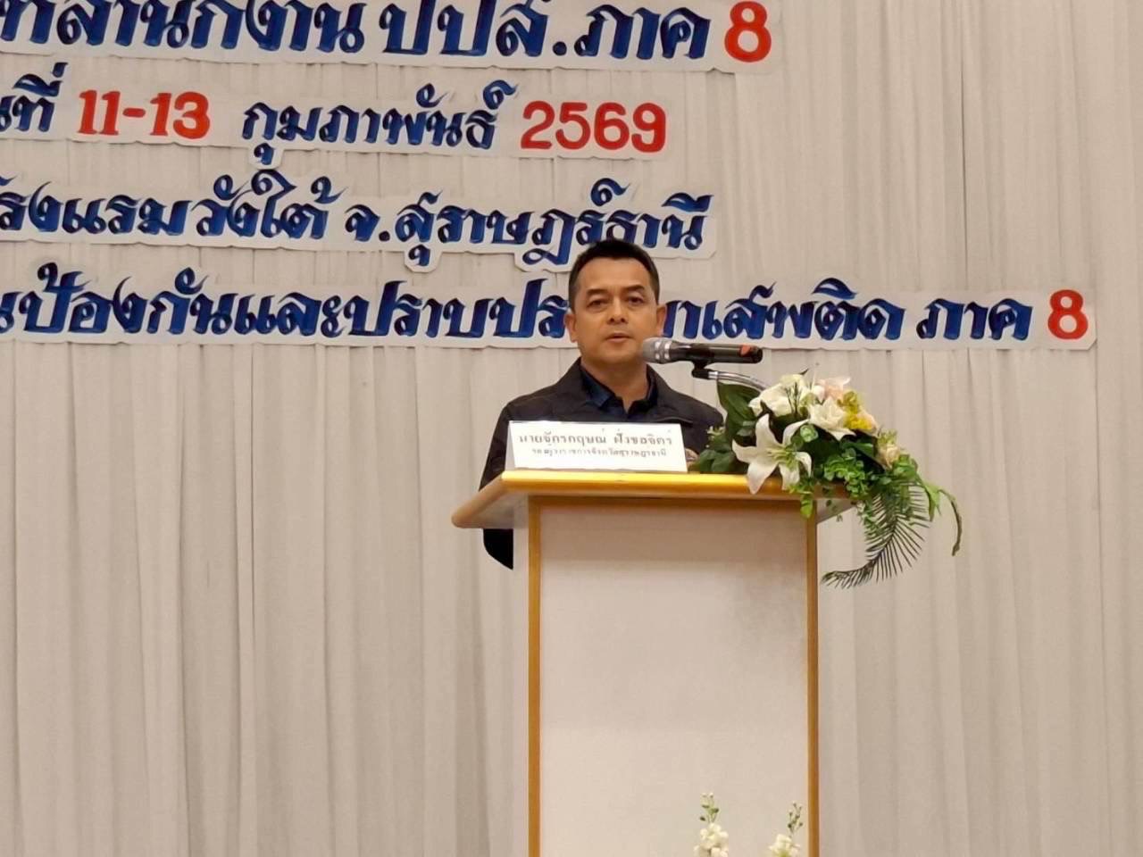 วันที่ 11 กุมภาพันธ์ 2569 สำนักงาน ปปส. ภาค 8 จัดโครงการอบรมเครือข่ายผู้ปฏิบัติงานในการฟื้นฟูสภาพผู้เสพ/ผู้ผ่านการบำบัดยาเสพติดในชุมชน (Recovery) ระหว่างวันที่ 11-13 กุมภาพันธ์ 2569 ณ โรงแรมวังใต้ อำเภอเมือง จังหวัดสุราษฎร์ธานี ซึ่งได้รับเกียรติจาก